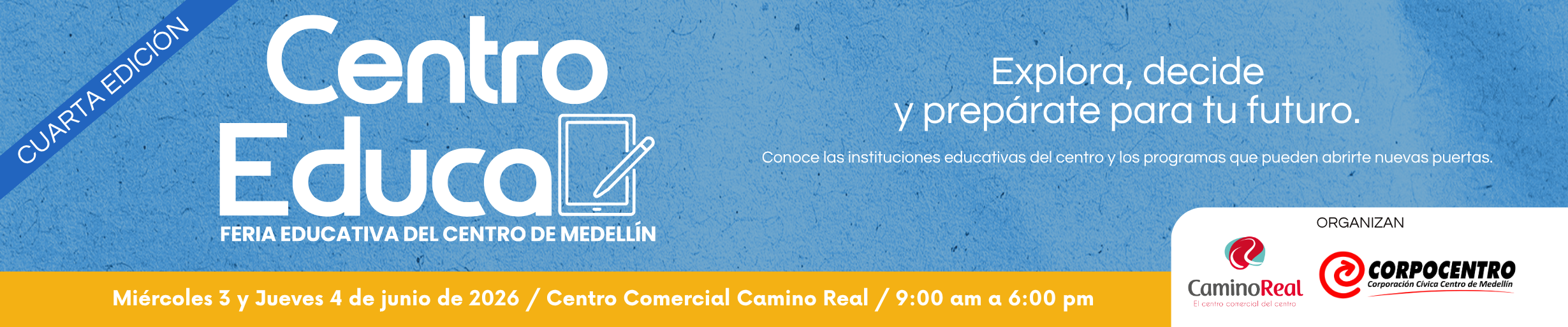 ¿Qué es Centro Educa? Centro Educa es la Feria Educativa del Centro de Medellín, organizada por Corpocentro y el Centro Comercial Camino Real, que reúne en un solo lugar la oferta académica de instituciones de educación para el trabajo y el desarrollo humano,...