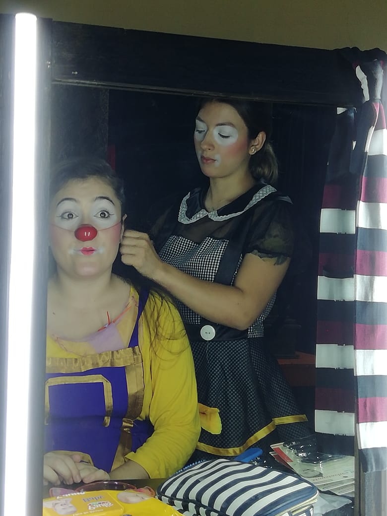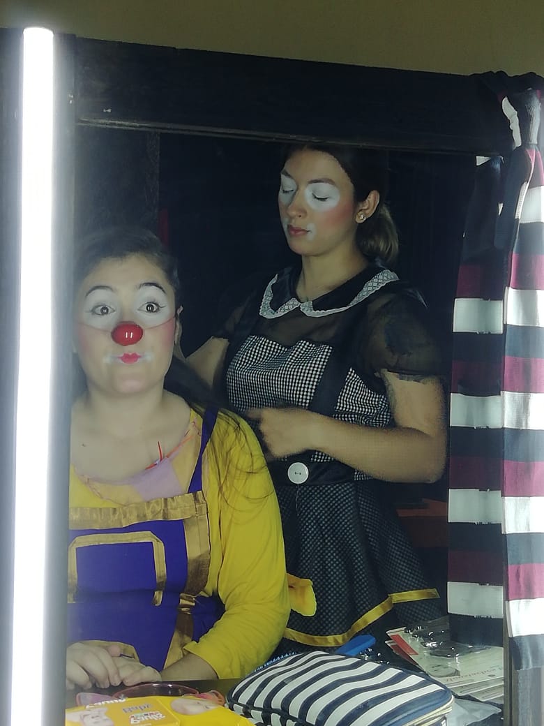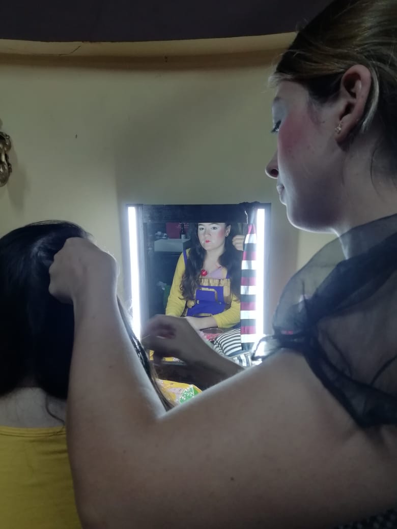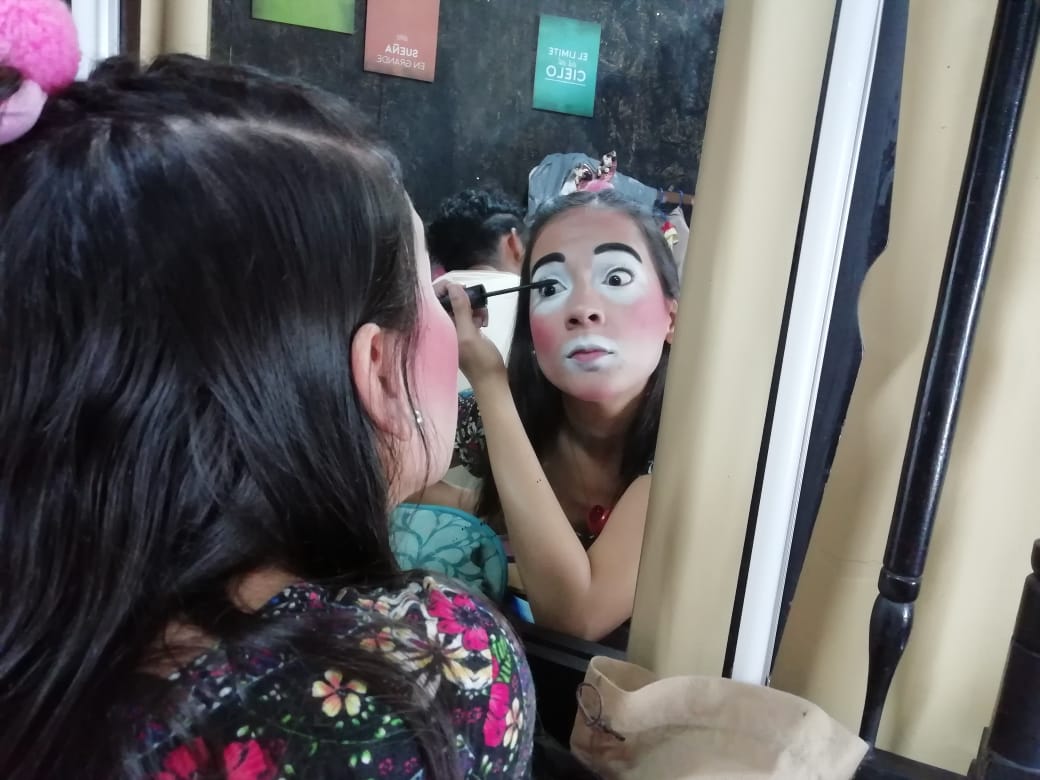 Al ingresar, antes de la función de la noche, vimos a las actrices que se preparaban para su público. Una cosa muy bella, miramos cómo una de las actrices maquillaba a su compañera, otra más lo hacía ella sola frente a un pequeño espejo. No hay personal extra que les ayude, es solo su esfuerzo y dedicación, así como lo son los inicios.
